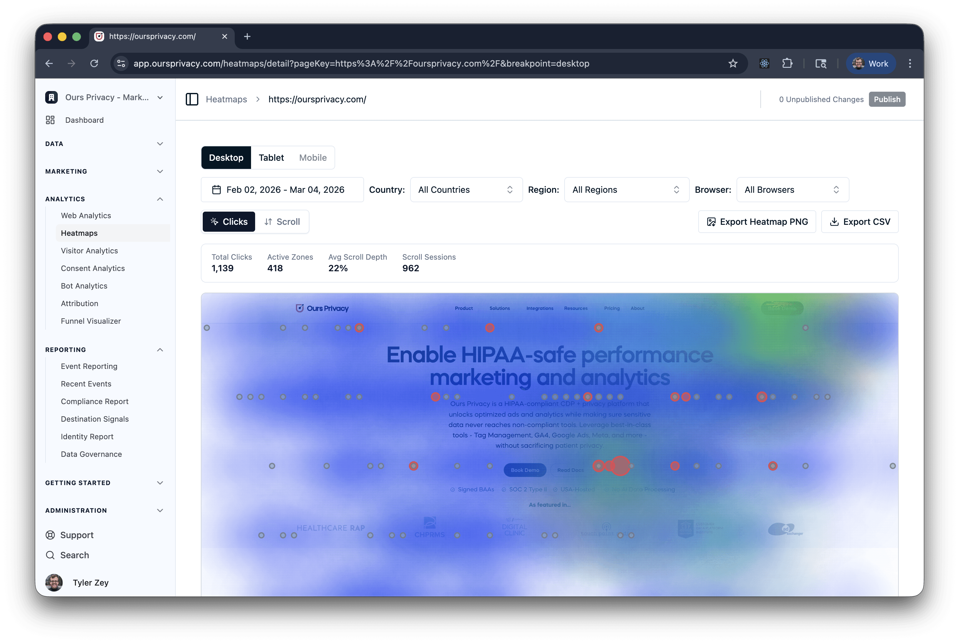 See how your highest-value audience interacts with a landing page. Compare heatmaps for consented vs. non-consented visitors. Watch session replays from visitors who dropped out of a funnel. The audience definition is applied as a query filter, so it works with any audience you've already built.