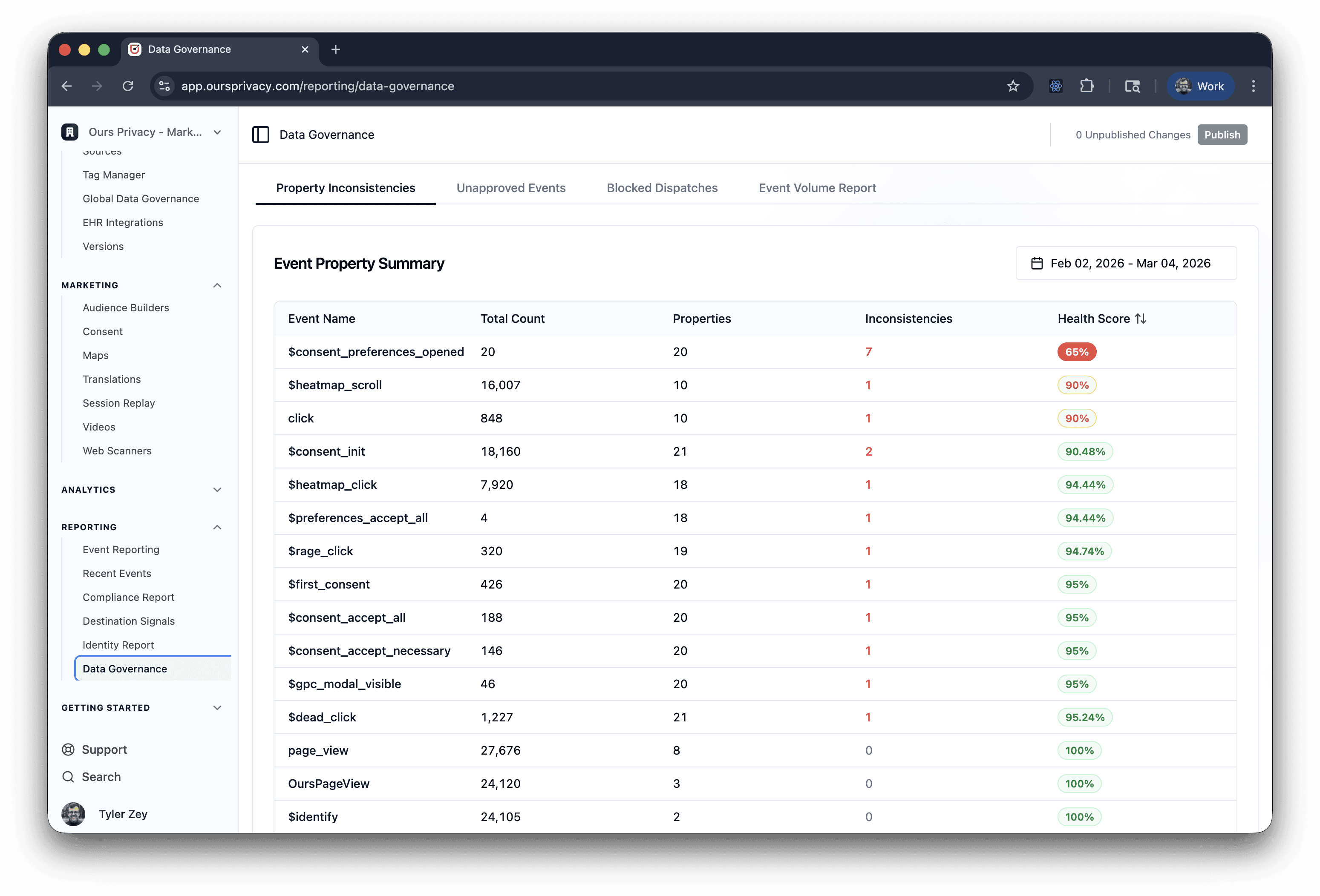 Property Inconsistencies shows every event in your account with a per-property breakdown. For each property on each event, you see coverage (what percentage of events include it), type distribution (string vs. number vs. boolean), and distinct value count. The system flags two patterns automatically: