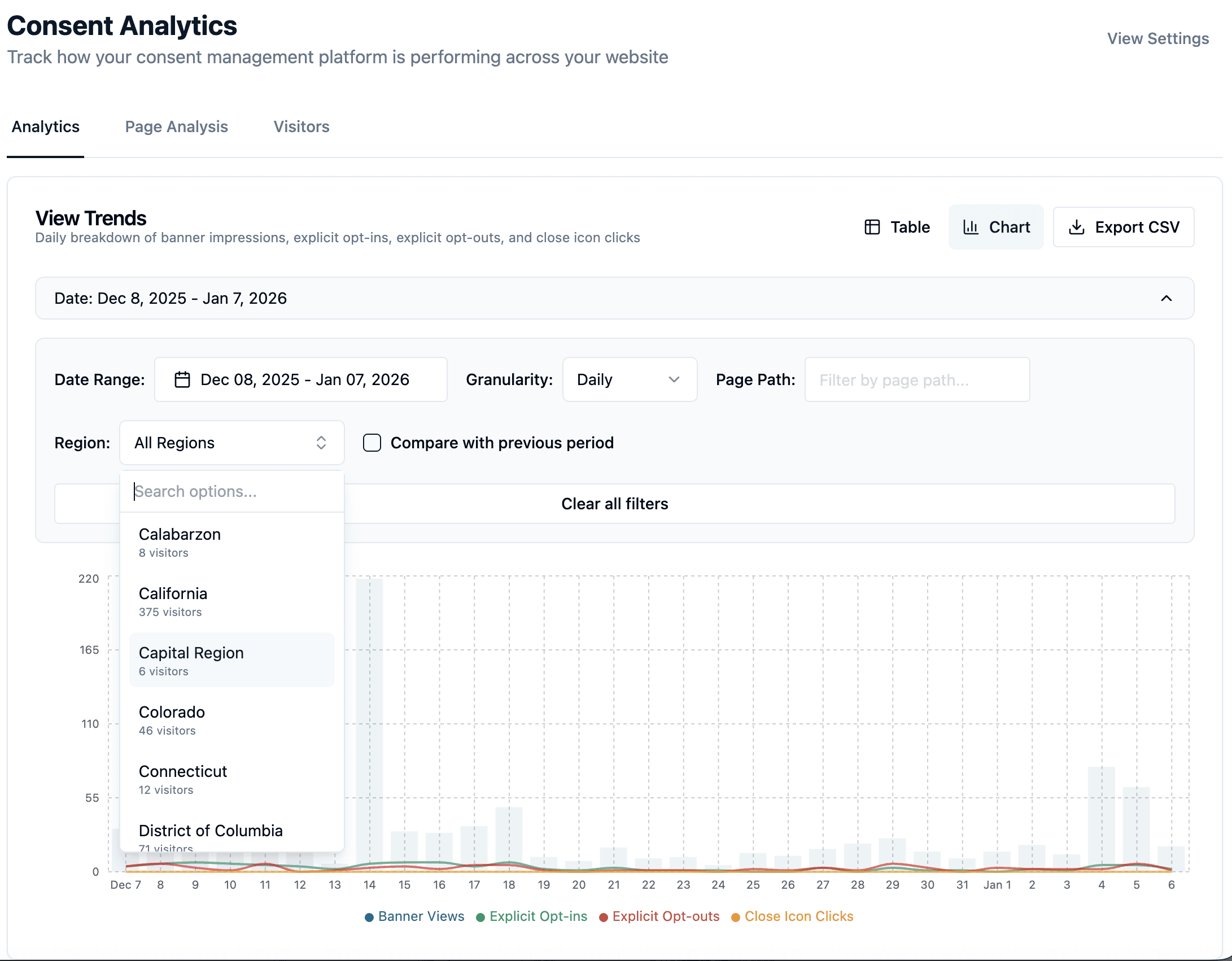View analytics by region - see consent rates and opt-out patterns broken down by geographic region