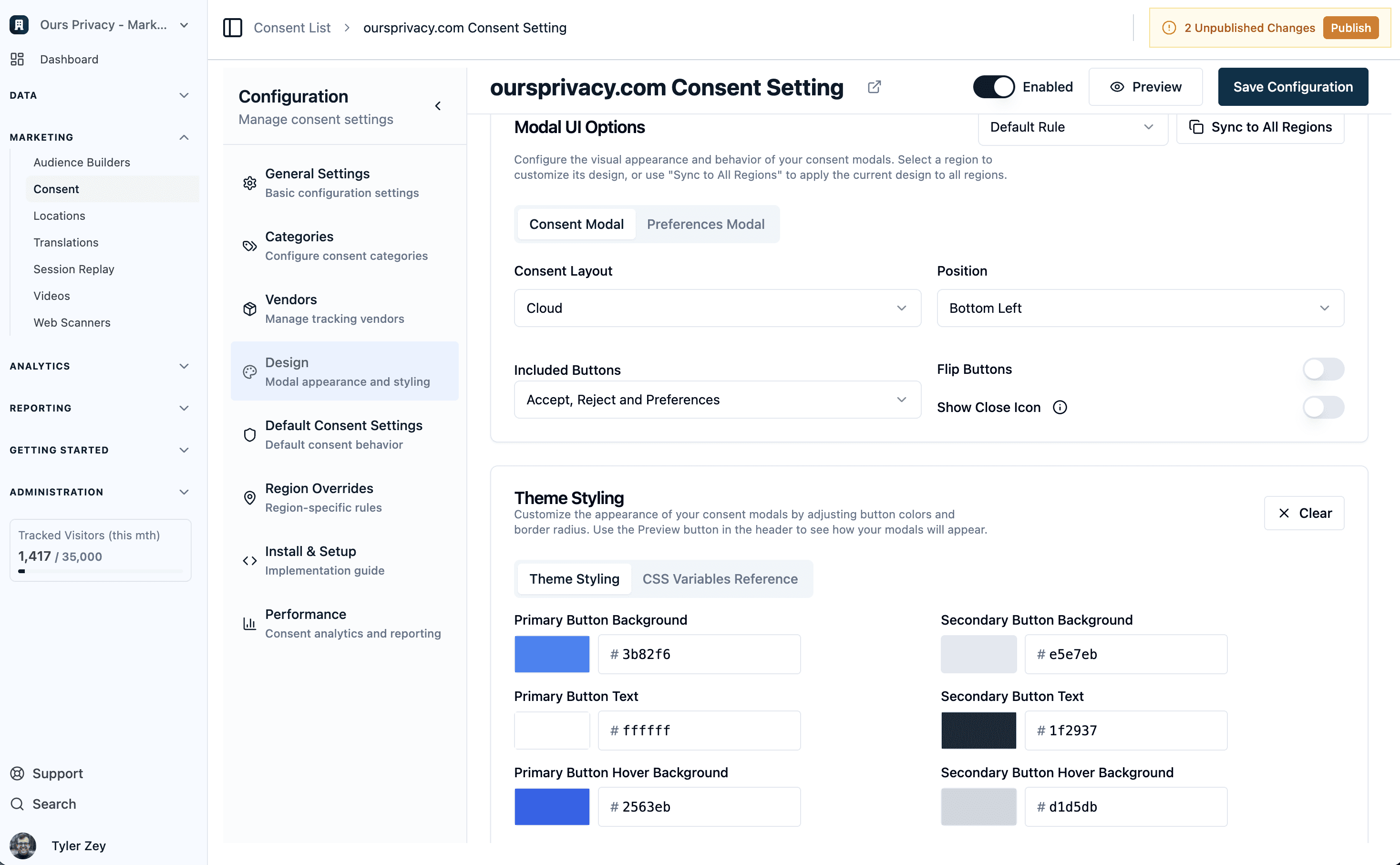 Customizing consent platform colors has previously required managing CSS variables, which can be cumbersome for non-technical team members. We've launched a Design Center that lets you save and manage your color palette directly in the UI.